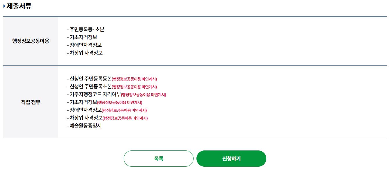 | 예술활동증명 | 한국예술인복지재단의 예술활동증명 유효 | 신청 가능 |