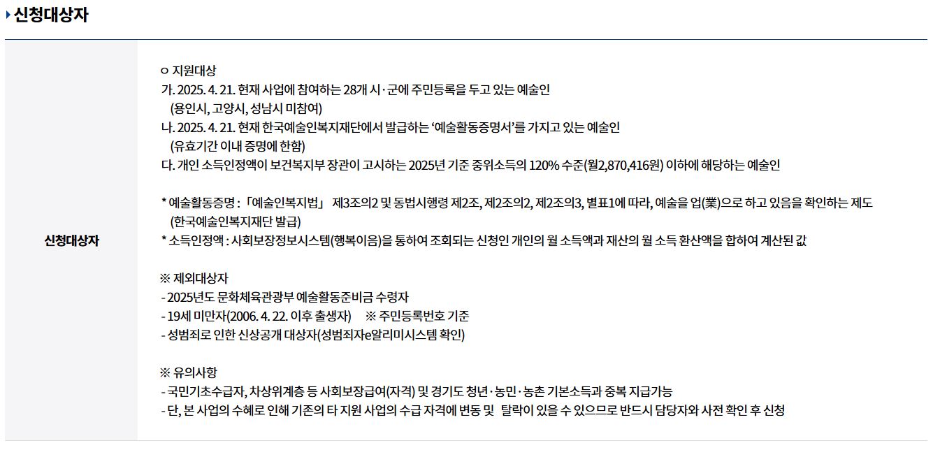 경기도 예술인 기회소득의 지원 대상은 다음과 같습니다. 신청자는 아래 조건을 모두 충족해야 합니다.