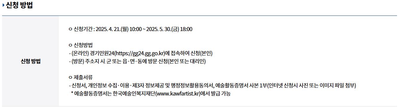 | 중복 지원 | 문화체육관광부 예술활동준비금 수혜자 제외 | 신청 불가 |