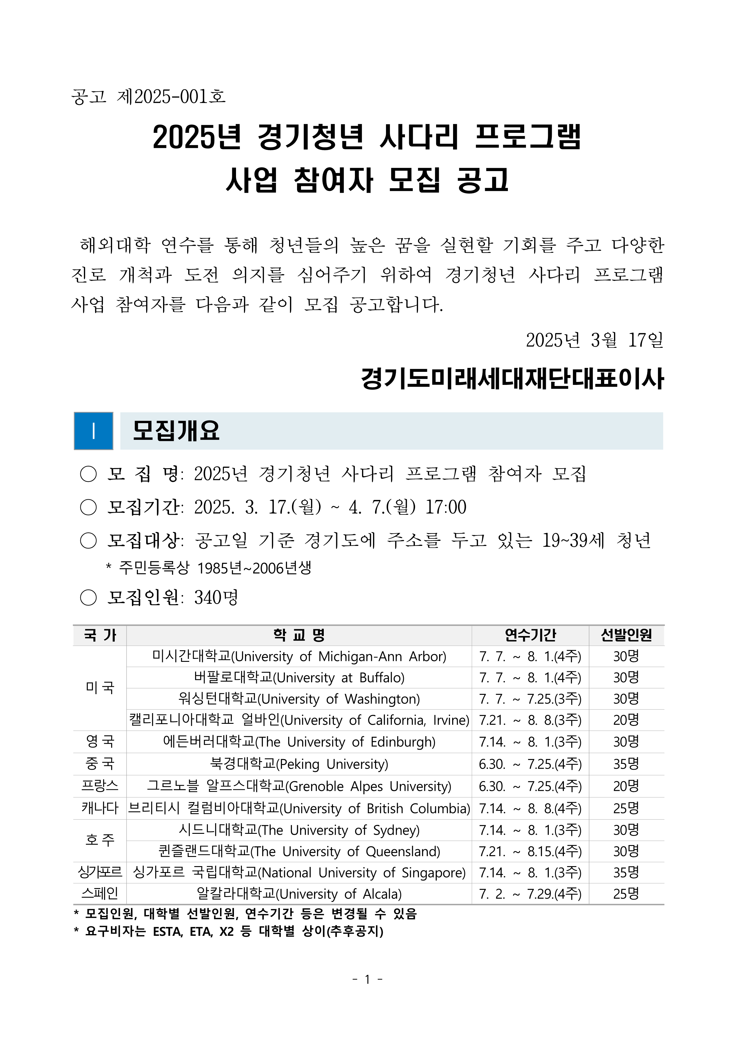 2025년 경기청년 사다리 프로그램은 경기도에서 청년들이 해외 대학 연수와 현지 문화 체험을 통해 자신의 꿈을 실현할 수 있도록 지원하는 프로그램입니다. 이 프로그램은 청년들에게 글로벌 경험을 쌓을 수 있는 기회를 제공하며, 다양한 역량을 강화할 수 있는 기회를 마련하고 있습니다.