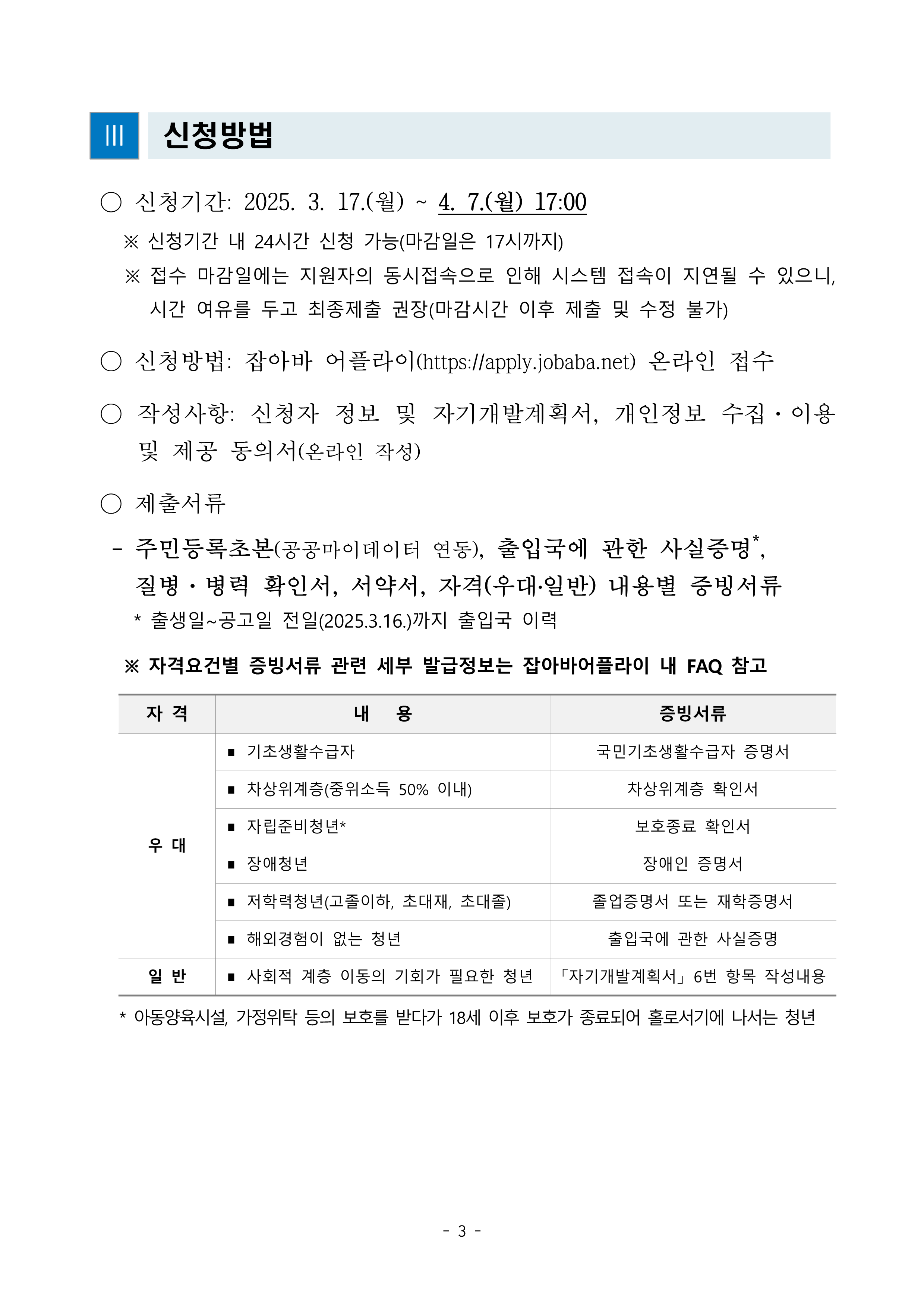 모집 기간은 2025년 3월 17일부터 4월 7일 17시까지입니다. 신청은 온라인으로 진행되며, 잡아바 어플라이를 통해 접수할 수 있습니다. 자세한 사항은 경기청년포털 웹사이트를 통해 확인할 수 있습니다.