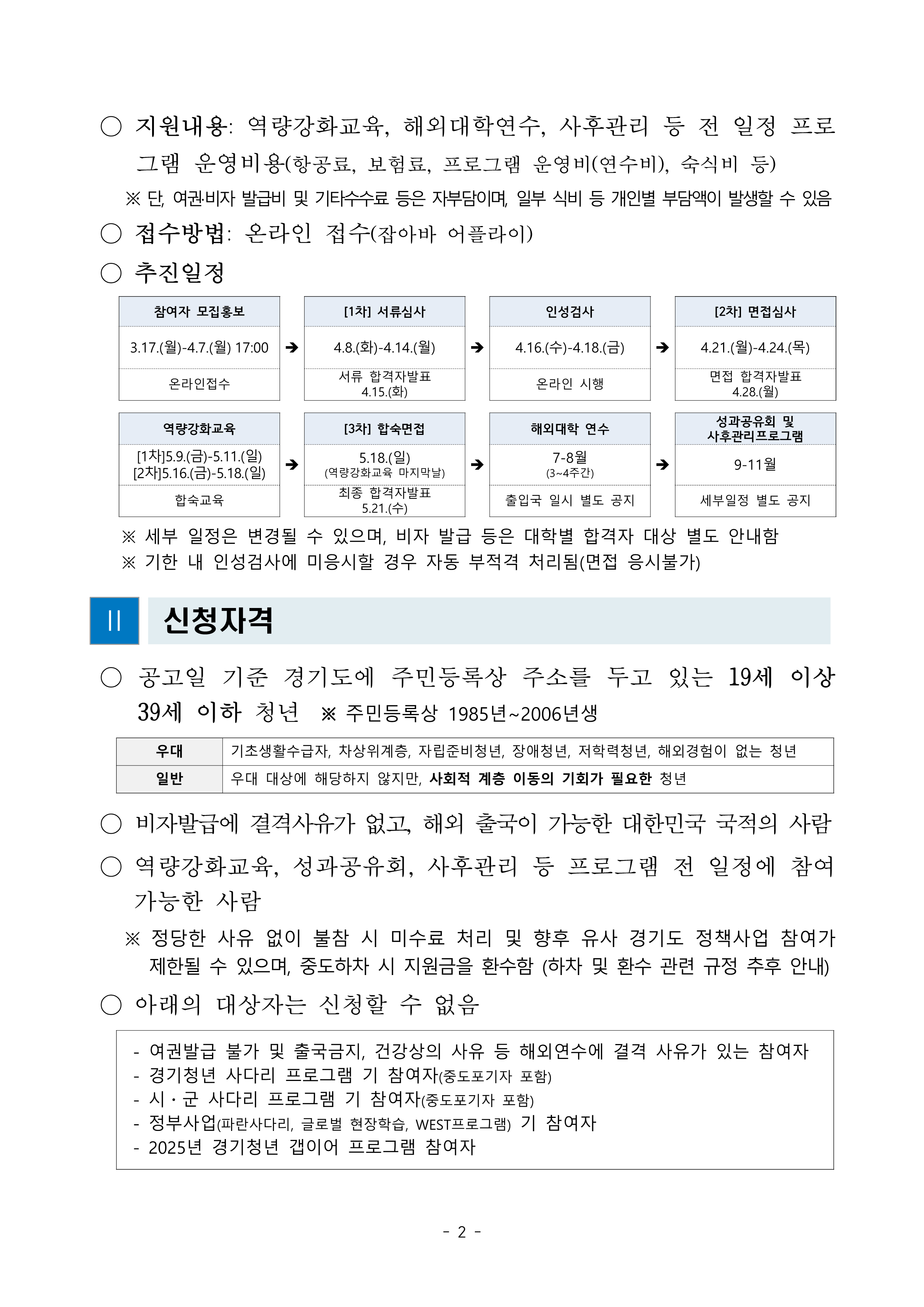 참여자에게는 다양한 지원 내용이 제공됩니다. 해외 대학 연수 기회, 현지 문화 체험, 역량 강화 프로그램 등이 포함되어 있으며, 이를 통해 청년들은 글로벌 감각을 키우고, 다양한 경험을 쌓을 수 있습니다. 또한, 프로그램에 참여하는 동안 필요한 경비 지원도 이루어집니다.