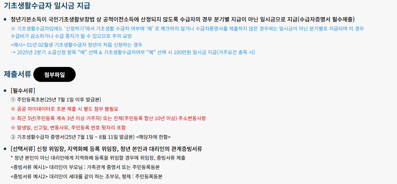 ● 기초생활수급자: 증명서 제출 시, 분기 지급 대신 일시금 100만 원 가능