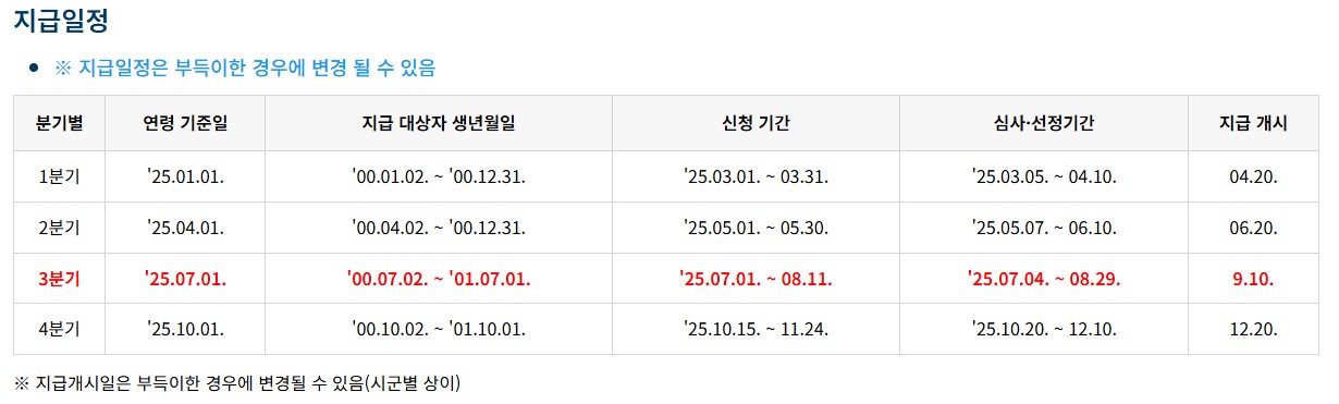 ● 소급 신청 가능자: 지난 분기 미신청자(연령·거주 요건 충족 시)