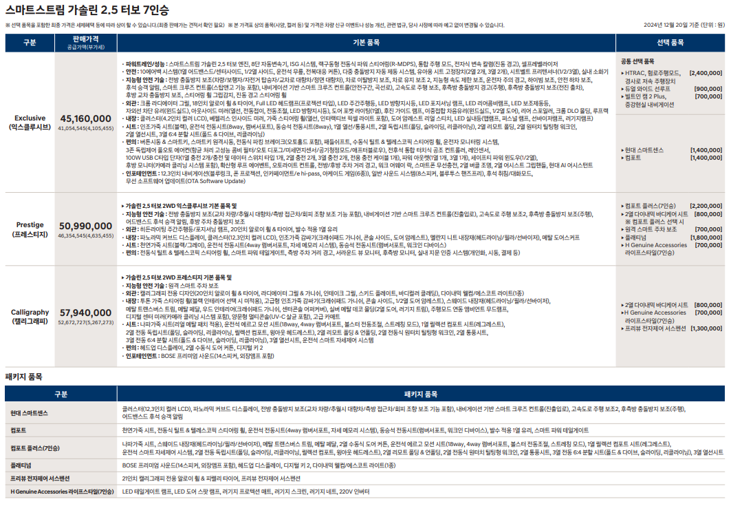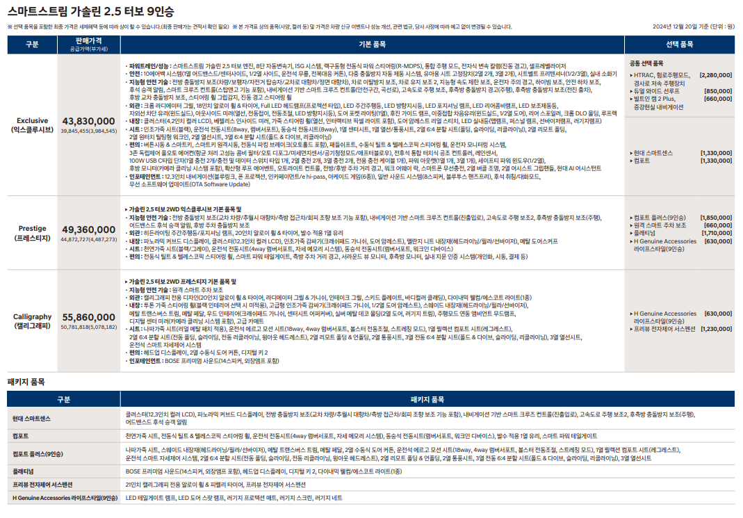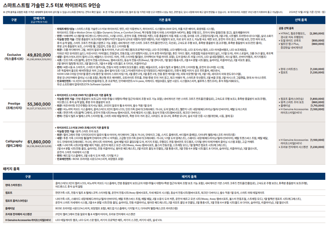 가격은 트림에 따라 다르게 책정됩니다. 9인승 모델의 경우, 익스클루시브 트림은 약 4,383만원, 프레스티지 트림은 4,936만원, 캘리그래피 트림은 5,586만원으로 예상됩니다. 7인승 모델은 익스클루시브가 5,146만원, 프레스티지가 5,536만원으로 책정될 것으로 보입니다. 이러한 가격대는 소비자들에게 매력적인 선택지를 제공할 것으로 기대됩니다.