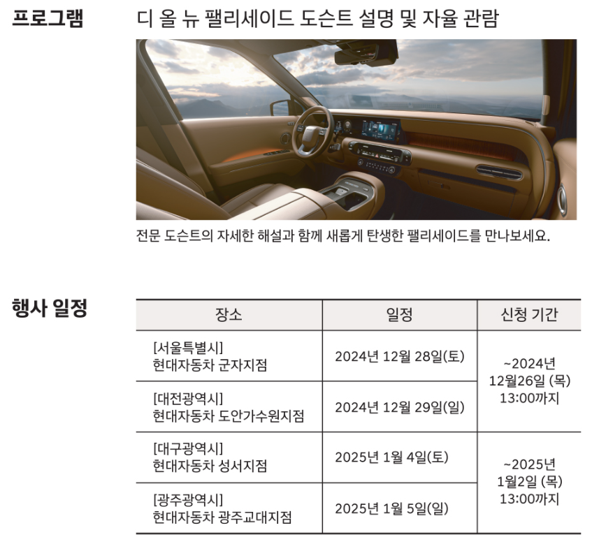 이상으로 2025 디 올 뉴 팰리세이드에 대한 정보를 알아보았습니다. 관심 있는 분들은 꼭 사전예약을 통해 새로운 경험을 해보시기 바랍니다.