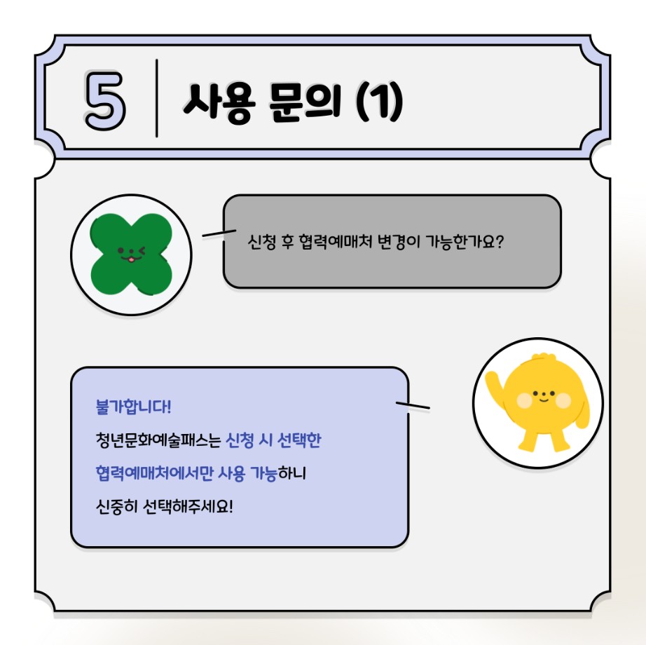 A. 공연, 전시, 영화, 축제 등 문화예술 전반에서 사용 가능하며, 협력 예매처(YES24, NOL)에서 예매 시 사용할 수 있습니다.