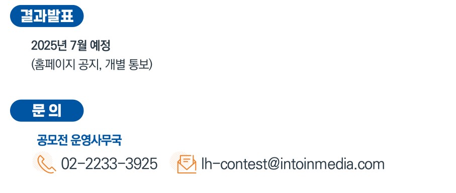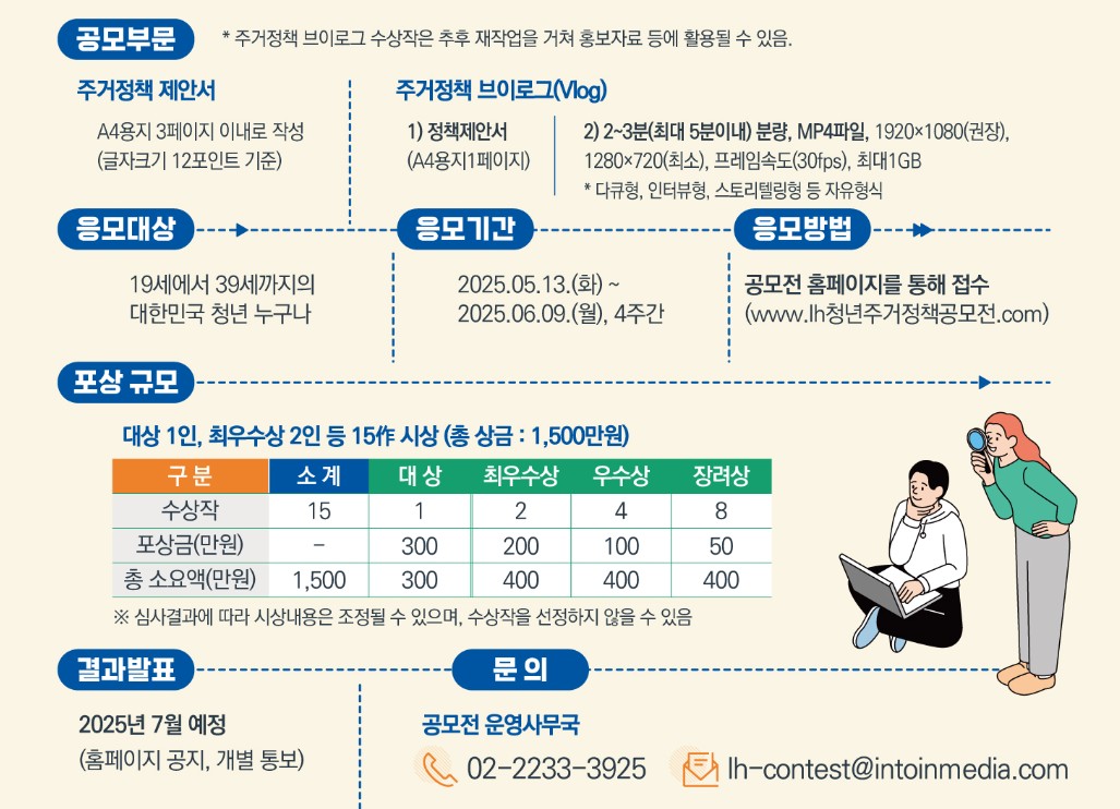 접수는 공식 홈페이지에서 가능하며, 궁금한 점은 운영사무국(02-2233-3925)으로 문의하시면 됩니다. 주관사는 인투인미디어이며, 공모전은 LH(한국토지주택공사)의 공식 후원을 받고 있습니다.