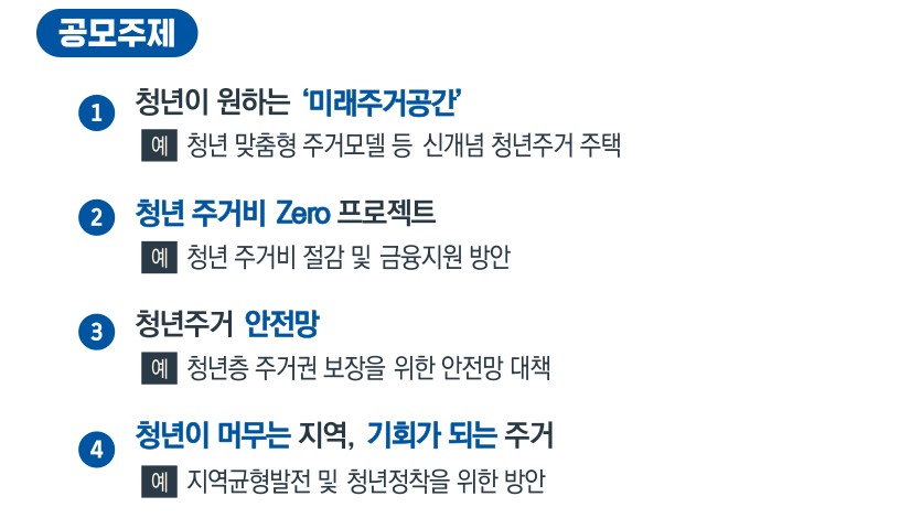 공모전의 제안 분야는 다양합니다. 예를 들어, 청년 임대주택 정책, 공유주택 활성화 방안, 주거비 부담 완화 대책 등 주거 안정에 기여할 수 있는 모든 아이디어가 대상입니다.